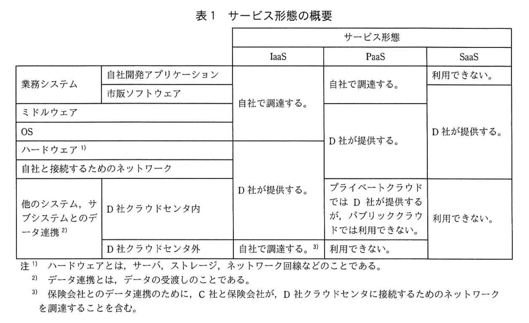 表1の「業務システム―市販ソフトウェア―IaaS」には「自社で調達する。」とあり、OSについても「IaaS」欄は空欄です。これは “D社が提供するOS” 以外でも IaaS なら導入可能 であることを示しています。
