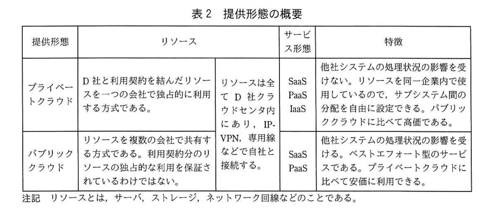 表2「パブリッククラウド」の特徴は「リソースを複数の会社で共有する…ベストエフォート型」であり、