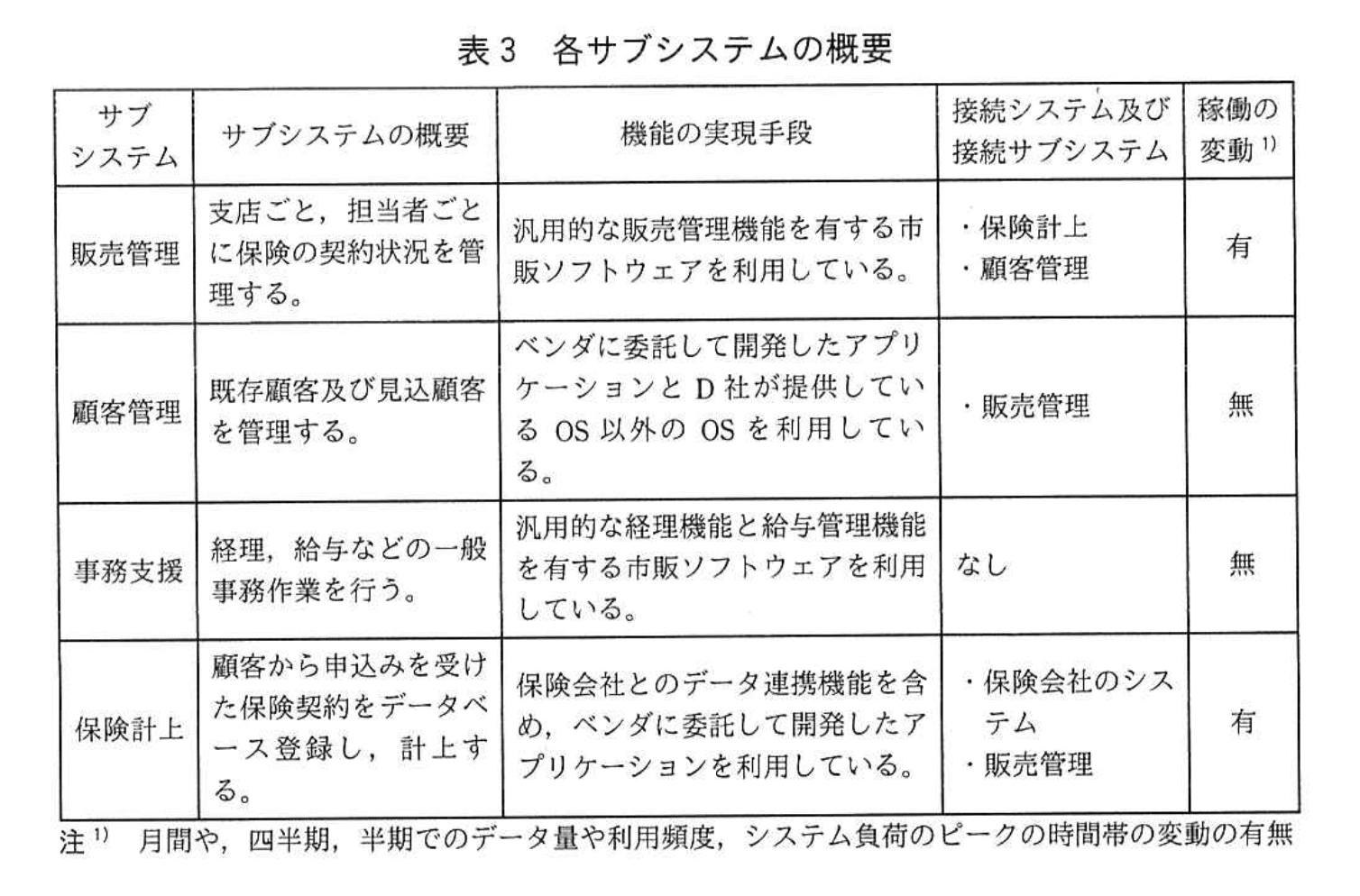 - 表3で顧客管理は「ベンダに委託して開発したアプリケーションとD社が提供しているOS以外のOSを利用している。」