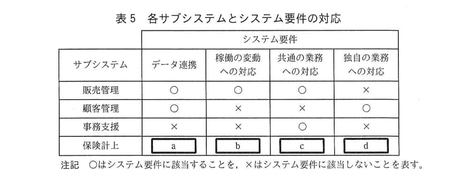 - 表5で販売管理は「データ連携」が○、「稼働の変動への対応」が○です。