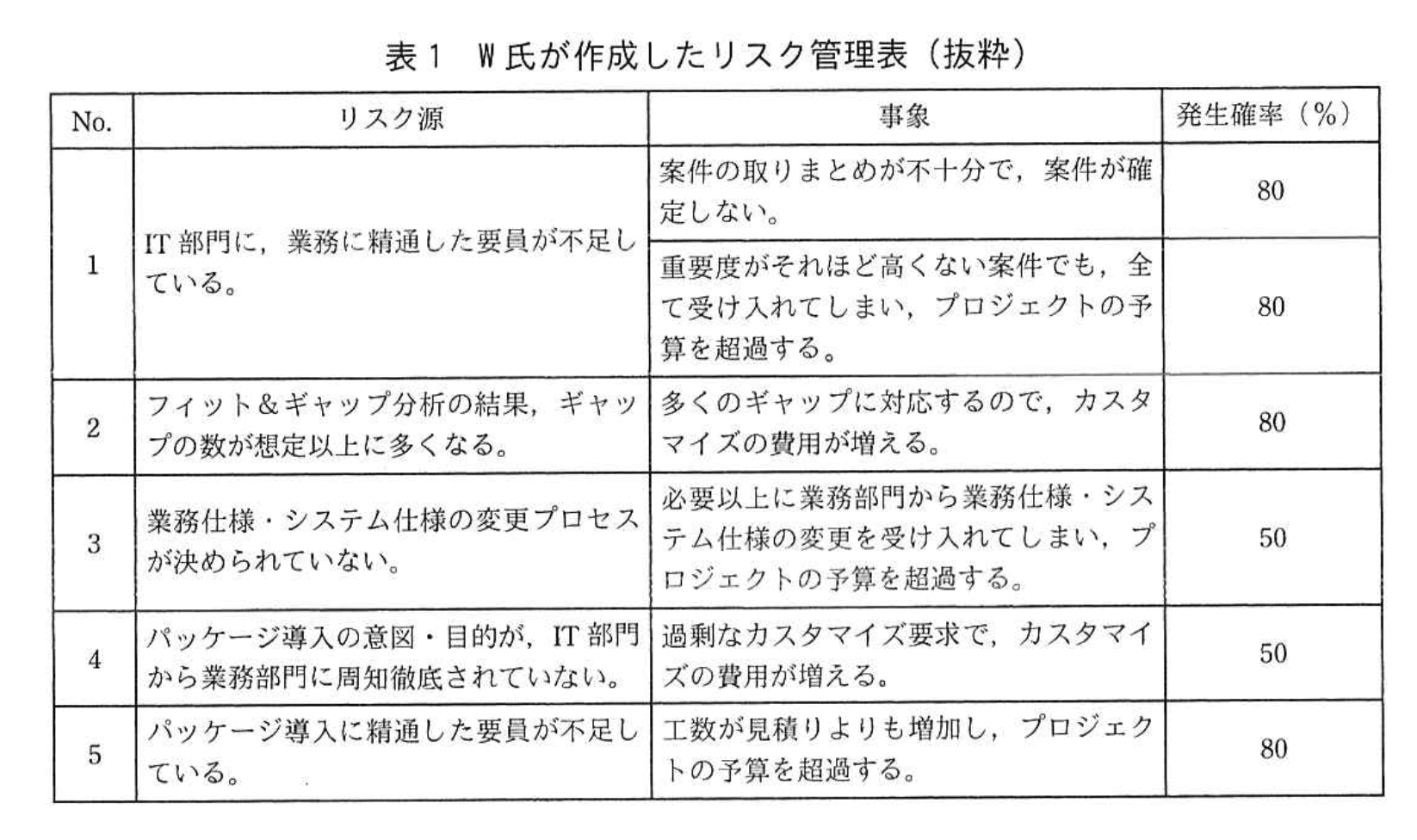 W氏は、特定したリスク源を、リスク管理表にまとめた。表1は、その抜粋である。表1中の“カスタマイズ”とは、O社の要求で機能を変更・追加したモジュールをパッケージに組み込むことをいう。