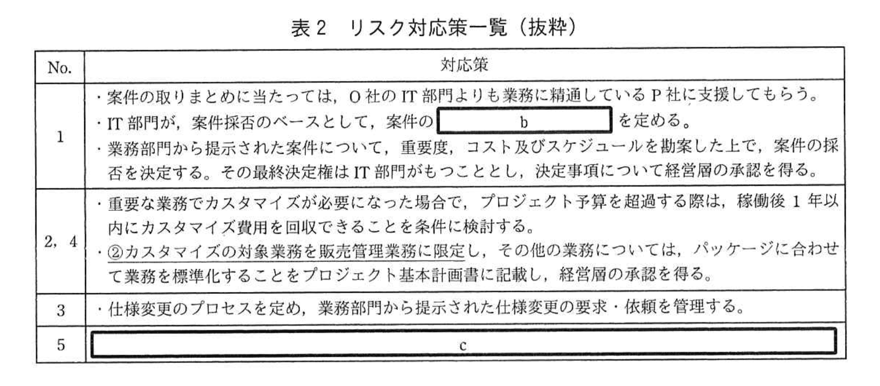 A: 表2は「リスク対応策一覧」であり、c はコストを“確保”して調達することで予算超過リスクを抑制する方策です。スキル不足による工数増よりも、即戦力投入で総コストをコントロールするほうが合理的です。