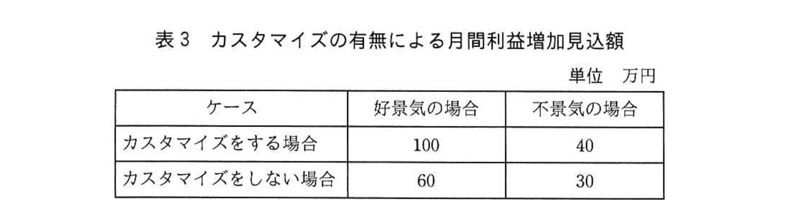 W氏は、投入可能なカスタマイズ費用の上限を見積もることにした。稼働してから1年間の景気動向予測では、好景気の確率が70%、不景気の確率が30%であり、カスタマイズの有無によって年間利益増加見込額が、表3のように変動することが予想されている。