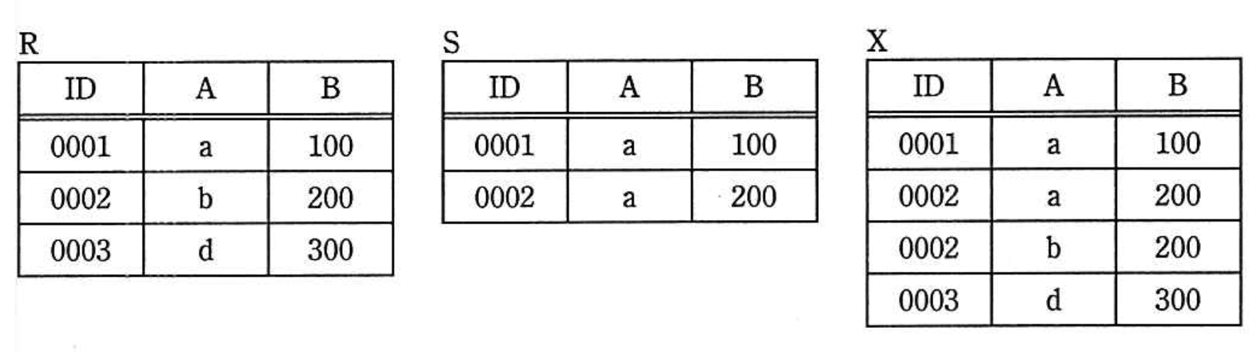 共通のIDを持つタプル同士を結合するため、Xのように全タプルが並ぶ形にはなりません。 - イ: 差