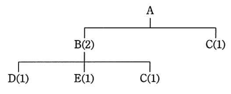 図は、製品 Aの構成部品を示し、括弧内の数字は上位の製品・部品1個当たりの所要数量である。この製品Aを 10 個生産する場合、部品 C は、少なくとも何個発注する必要があるか。ここで、現在の部品 Bの在庫は0個、部品 Cの在庫は5個である。