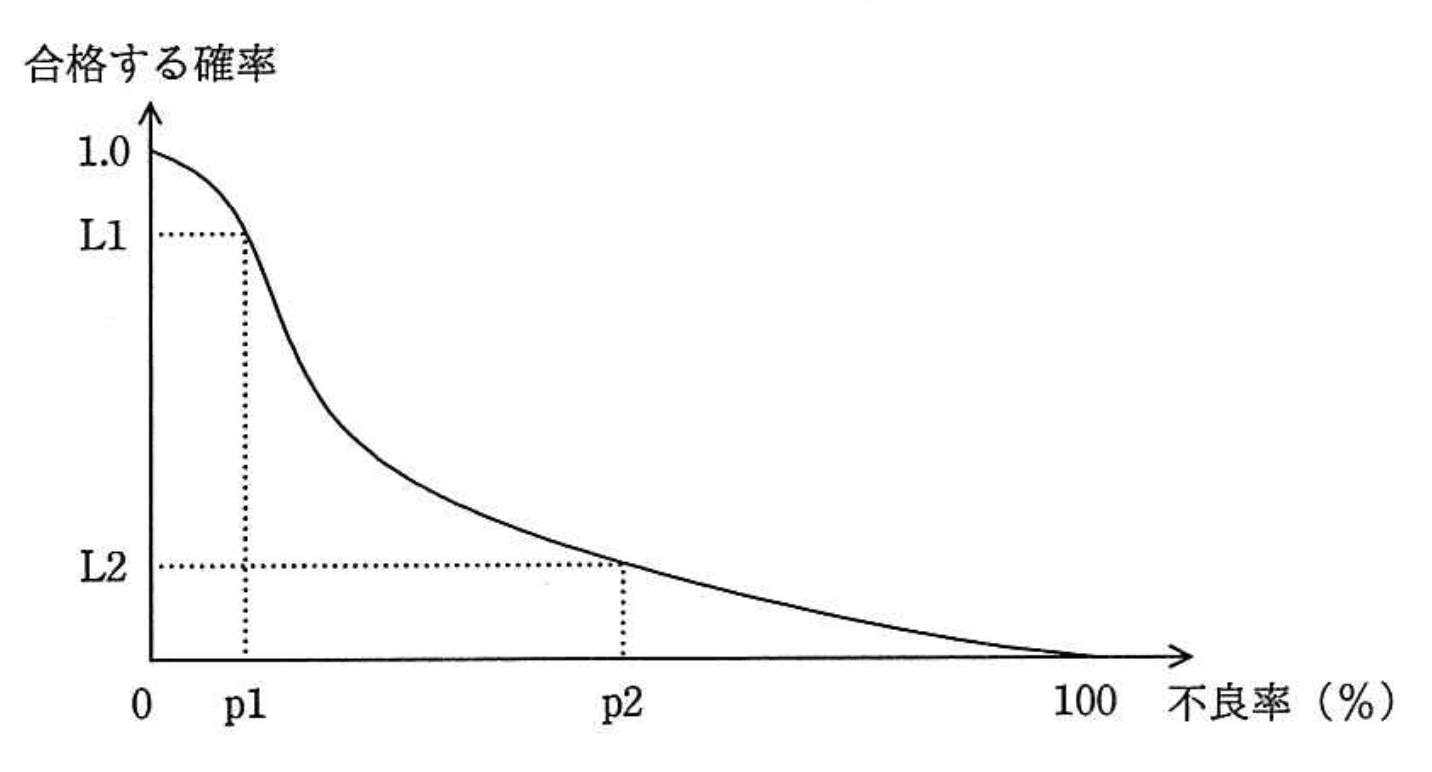 - 根拠:OC曲線は不良率の増加に伴い合格確率が減少する関係を示し、の位置から垂直に上げた点の合格確率がです。