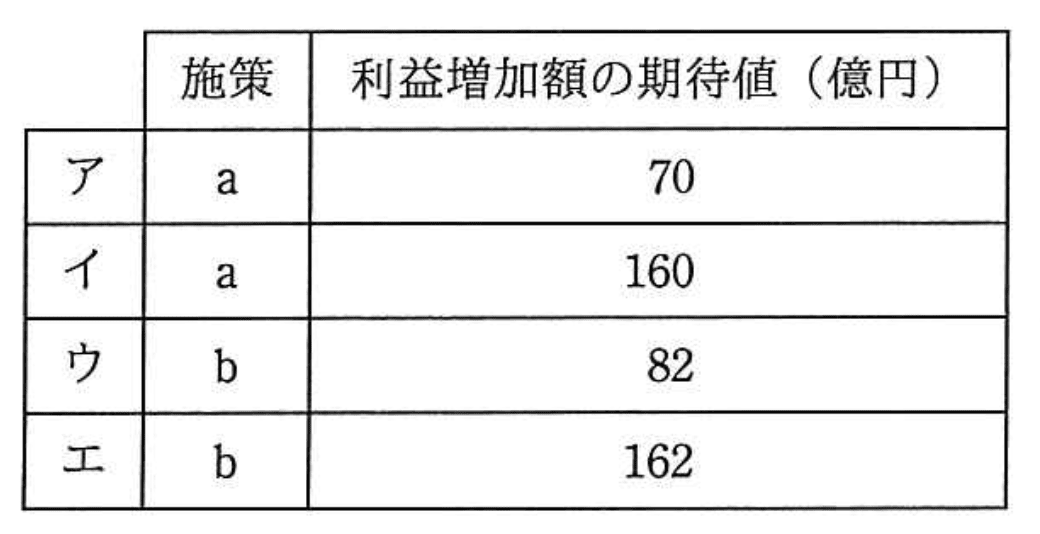 - 結論:マーケティング施策bの利益増加額期待値は82億円で最大となり、選択肢はウです。