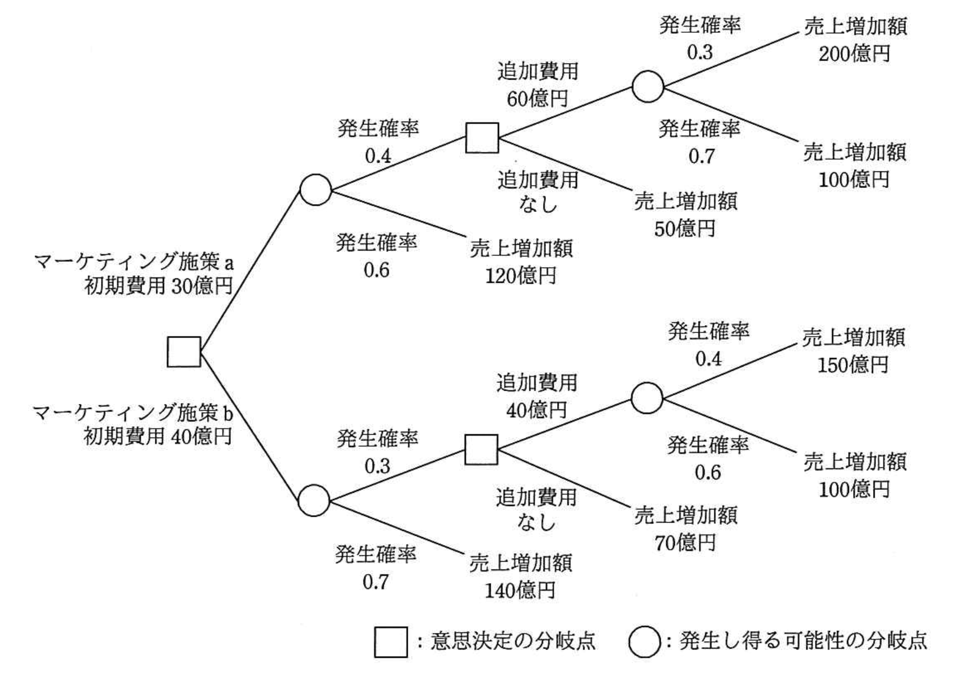 マーケティング施策bの期待値計算を詳細に行うと、初期費用40億円を差し引いた後の利益増加額期待値が82億円となり、他の選択肢よりも高いため正解です。施策aは複雑な分岐があるものの、期待値計算の結果、施策bの方が利益期待値が高いことが判明します。