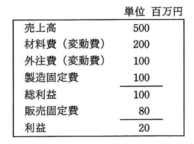 - 限界利益は売上高500百万円-変動費(材料費200百万円+外注費100百万円)=200百万円。