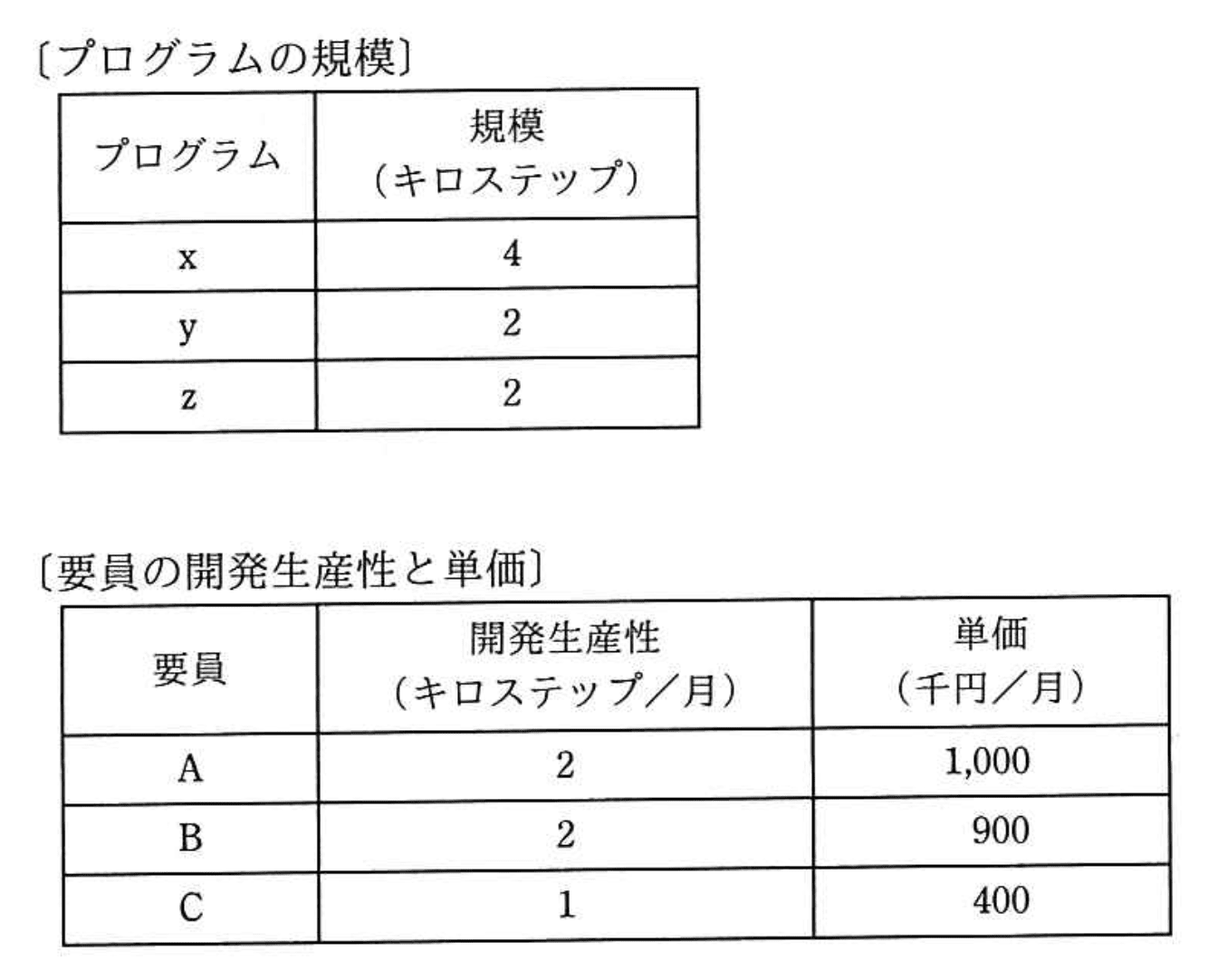 プログラム x, y, zの開発を2か月以内に完了したい。外部から調達可能な要員は A, B, Cの3名であり、開発生産性と単価が異なる。このプログラム群を開発する最小のコストは、何千円か。ここで、各プログラムの開発は、それぞれ1名が担当し、要員は開発生産性どおりの効率で開発できるものとする。また、それぞれの要員は、担当したプログラムの開発が完了する時点までの契約とする。