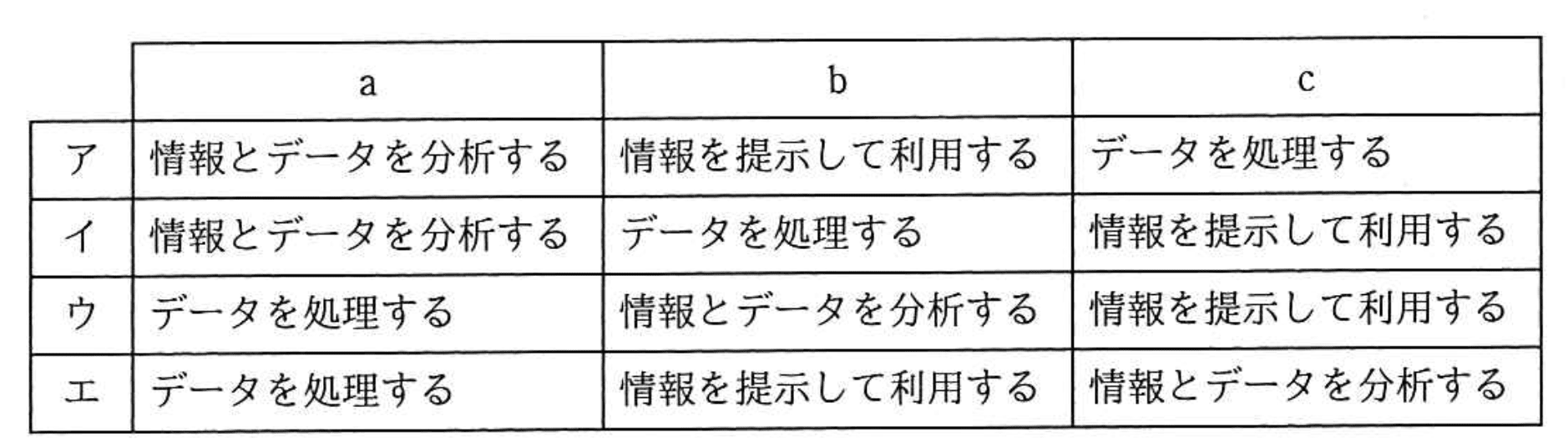 - 正しい順序(データ処理→分析→情報提示)に合致する選択肢を選ぶ。