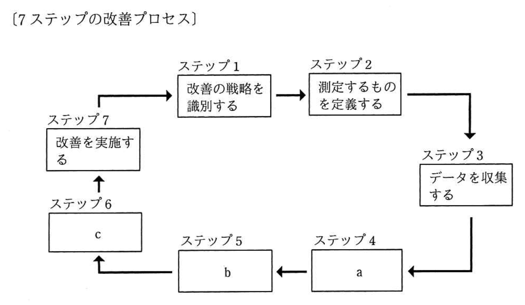 ITIL 2011 edition によれば,7ステップの改善プロセスにおける a,B及び cの適切な組合せはどれか。