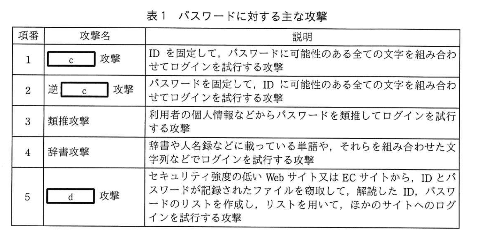 → 日本語名称が複数あるため、「パスワードリスト」を正確に書けないケースがあります。設問は空欄 d に入る単語(攻撃名)を要求しているので、説明文に登場する“リスト”を手掛かりに決定しましょう。 - “c” に英語だけ/日本語だけで書き切れず減点