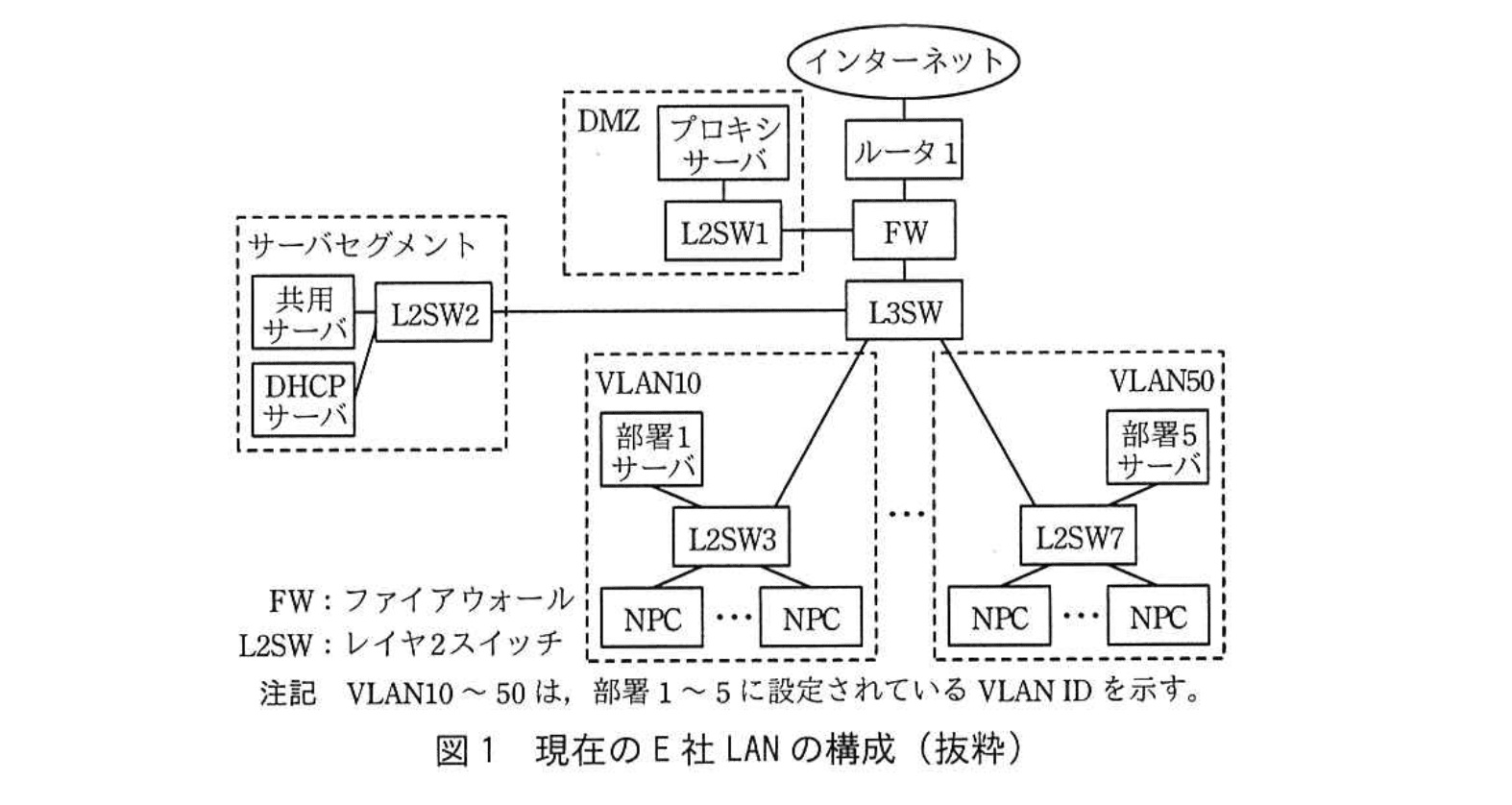 E社は、社員数が150名のコンピュータ関連製品の販売会社であり、オフィスビルの2フロアを使用している。社員は、オフィス内でノートPC(以下、NPCという)を有線LANに接続して、業務システムの利用、Web閲覧などを行っている。社員によるインターネットの利用は、DMZのプロキシサーバ経由で行われている。現在のE社LANの構成を図1に示す。