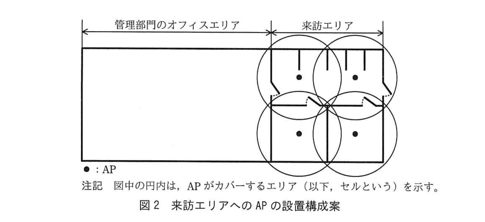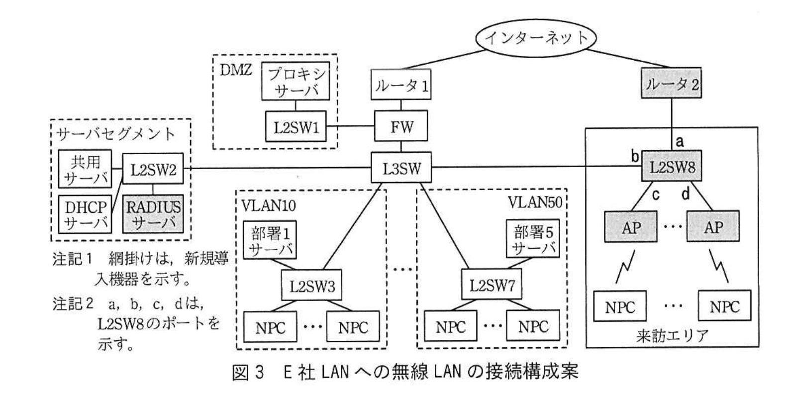 これらの検討を基に、Gさんは無線LANの構成を設計した。来訪エリアへのAPの設置構成案を図2に、E社LANへの無線LANの接続構成案を図3に示す。