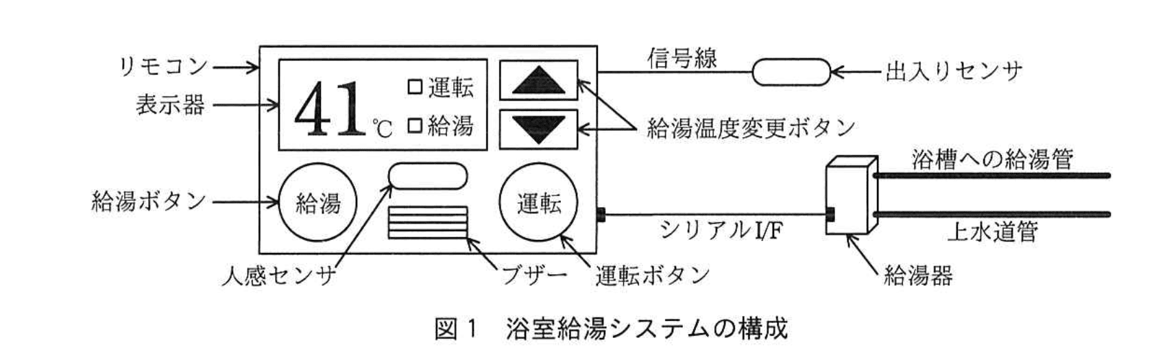 (1) リモコンは、各ボタンによって操作を受け付け、給湯器に指示を送信する。