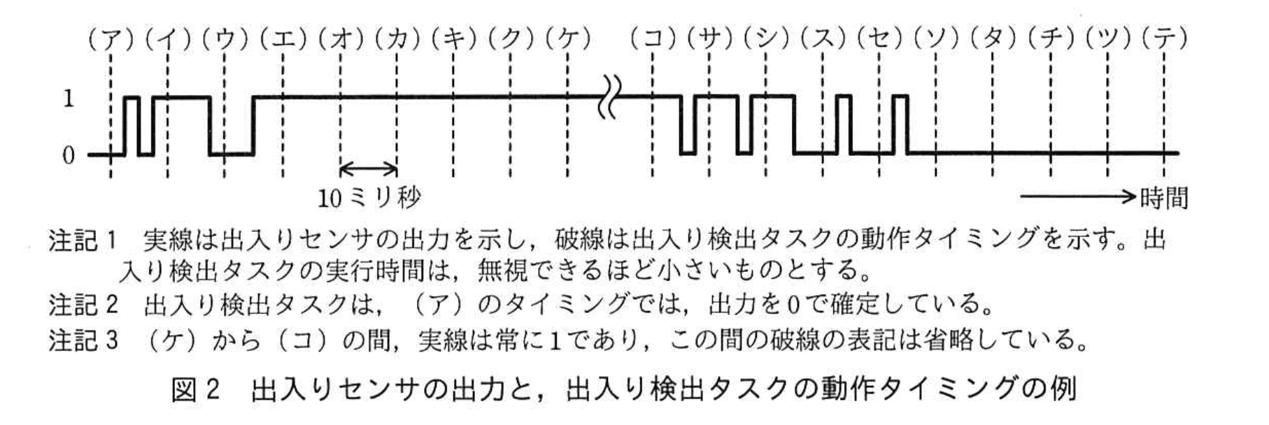 (2)出入り検出タスクが“出入り”を通知した後、出力を0で確定する最初のタイミングを、(ア)〜(テ)の記号で答えよ。