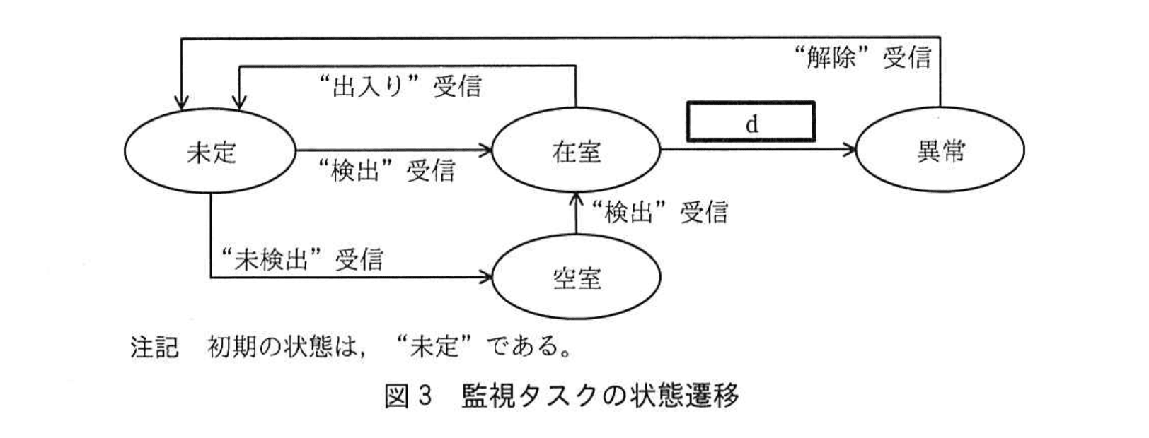 A: “在室”で [ d ] のタイマが満了すると“異常”に遷移します。したがって正しく在室を維持できないと誤報・漏報につながるため、このステートマシンが鍵になります。