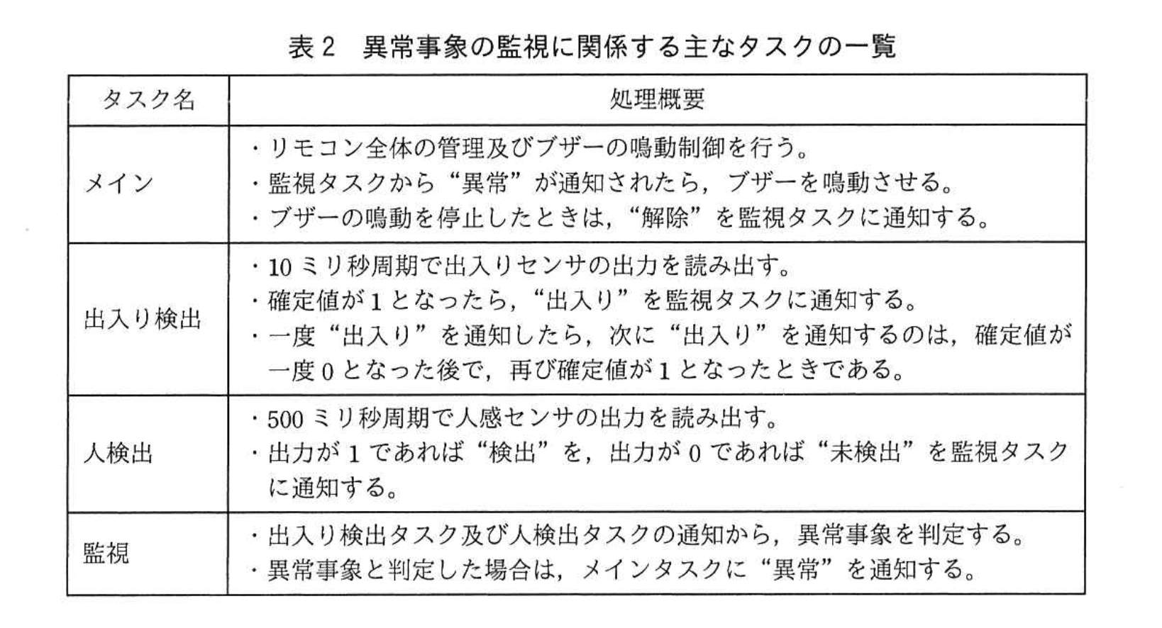 リモコンの組込みソフトウェアには、リアルタイム OS を使用する。異常事象の監視に関係する主なタスクの一覧を表2に示す。