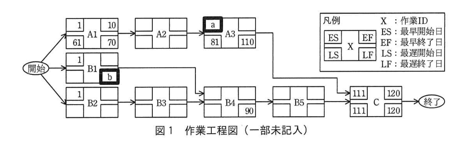 作業間の制約は図1に示され、A2 ― A3 間と B1 ― B3 間の矢印上に空欄 a、b が置かれている。 -