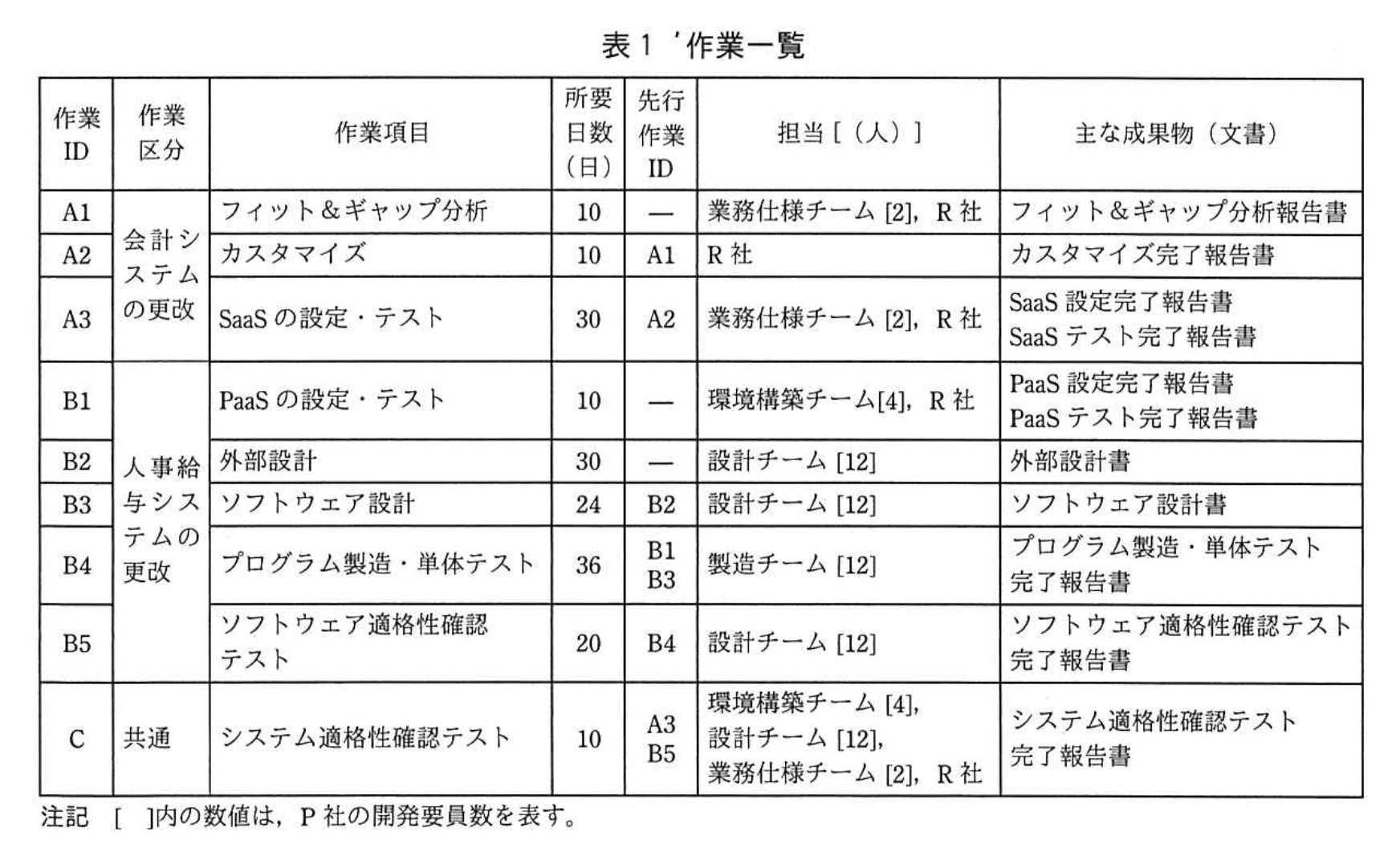 S課長が、表1の作業一覧と図1の作業工程図について、Q部長に説明したところ、会計システムの更改においては、①フィット&ギャップ分析が完了した時点で、必要に応じて作業一覧と作業工程図を修正するよう、指示があった。