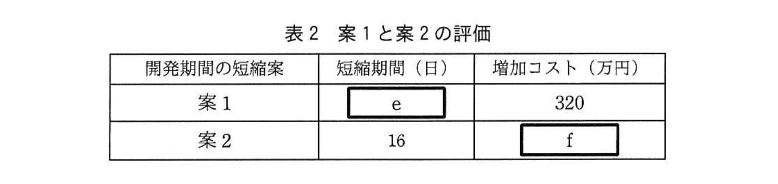 開発期間の短縮策として、開発要員を追加して作業計画を見直す案(以下、案1という)と開発要員を追加しないで作業計画を見直す案(以下、案2という)を評価して、採用する案を決定することにした。