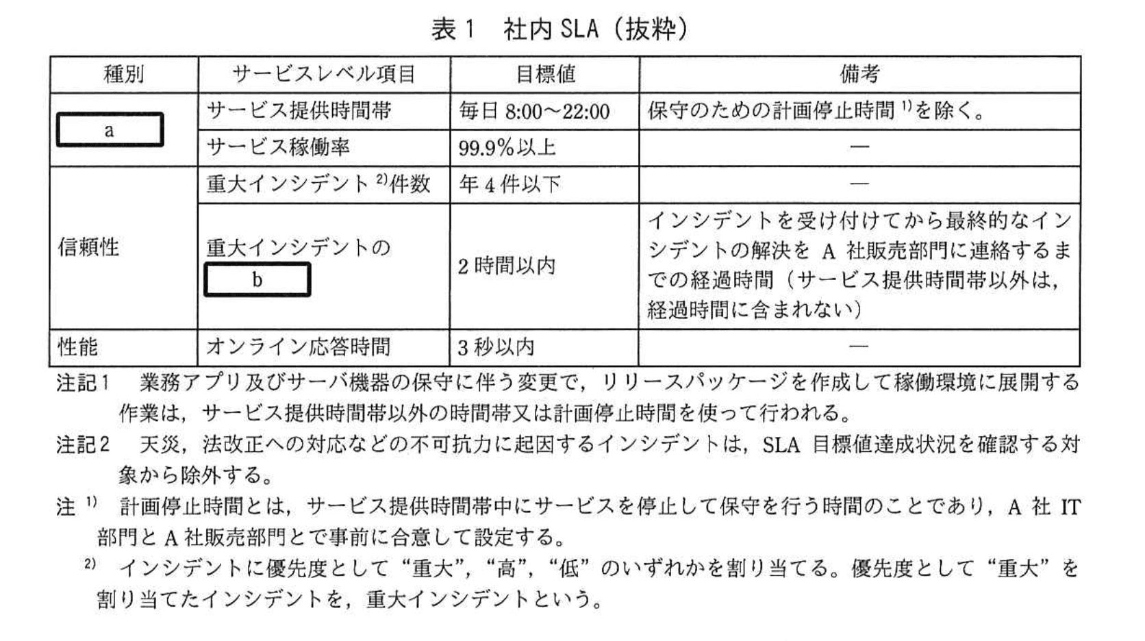 A社IT部門とA社販売部門との間で合意している基幹サービスのSLA〔以下、社内SLAという〕の抜粋を、表1に示す。