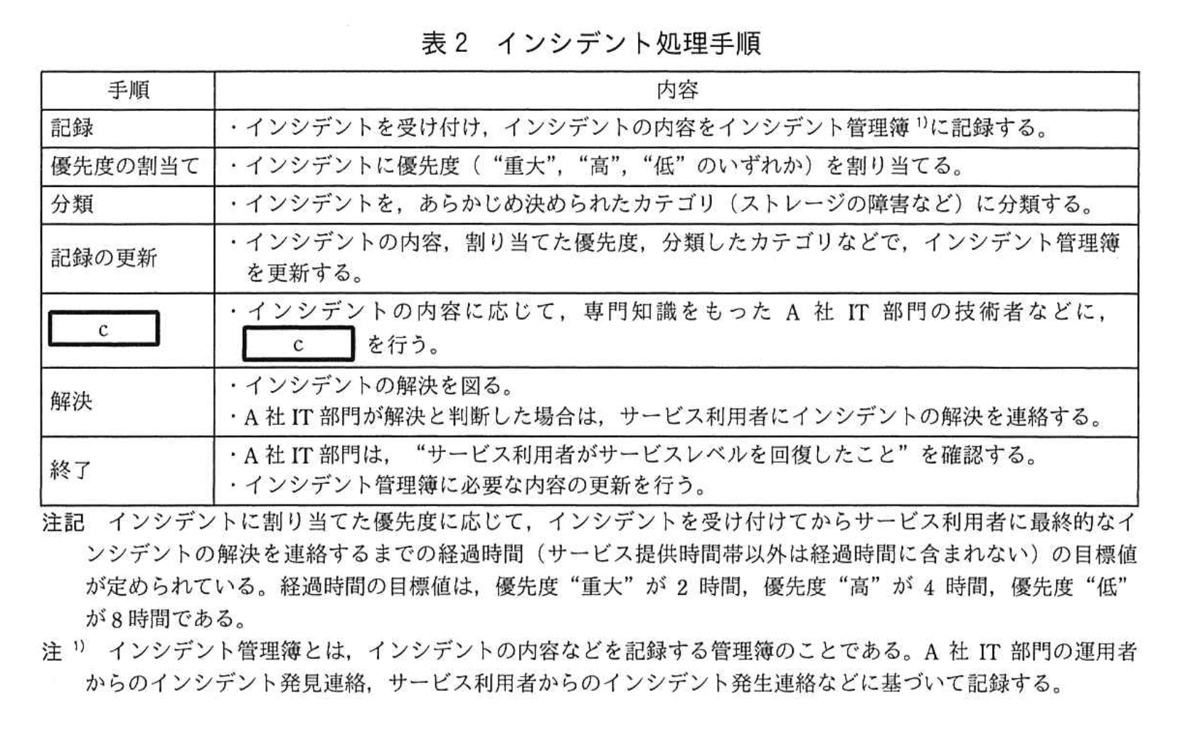 - 【問題文】表2「インシデント処理手順」のcの行には