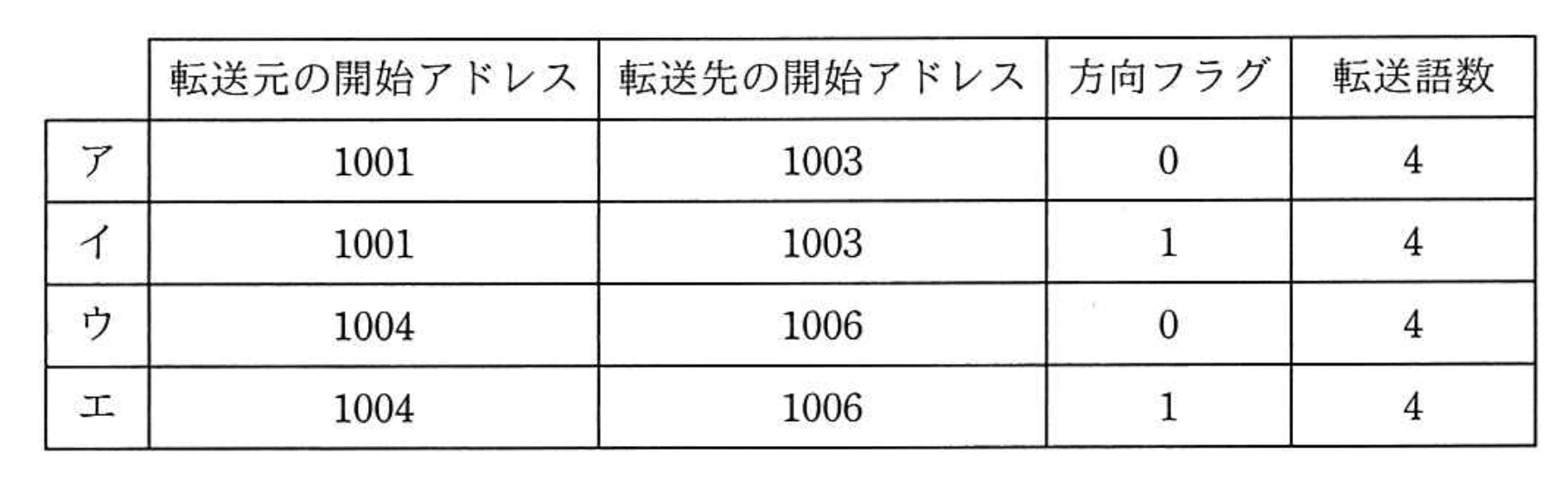- エ:方向フラグ1(降順)、開始アドレス1004(転送元)、1006(転送先)で正しい。