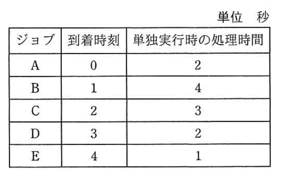 - 根拠:処理時間順方式(SJF)では、到着済みの中で最も処理時間が短いジョブを優先し、ジョブBは後半に実行されるため待ち時間が長くなる。