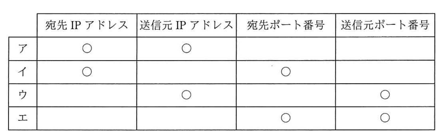プライベートIPアドレスを割り当てられたPCがNAPT(IPマスカレード)機能をもつルータを経由して、インターネット上のWebサーバにアクセスしている。WebサーバからPCへの応答パケットに含まれるヘッダ情報のうち、このルータで書き換えられるフィールドの組合せとして、適切なものはどれか。ここで、表中の○はフィールドの情報が書き換えられることを表す。