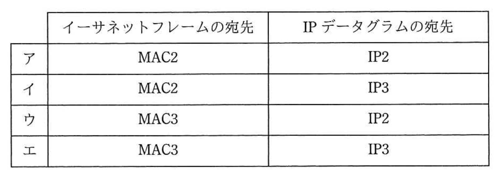 したがって、イーサネットフレームの宛先はMAC3、IPデータグラムの宛先はIP2となり、選択肢ウが正解です。