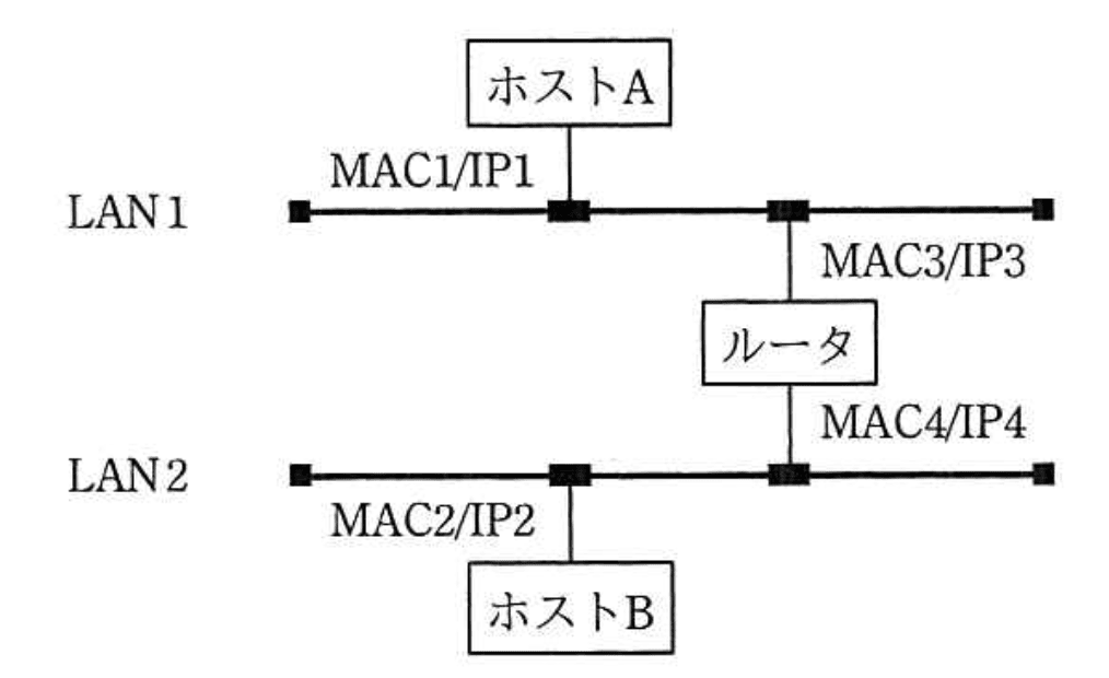 ホストAとホストBは異なるLAN(LAN1とLAN2)に属しているため、直接通信できません。