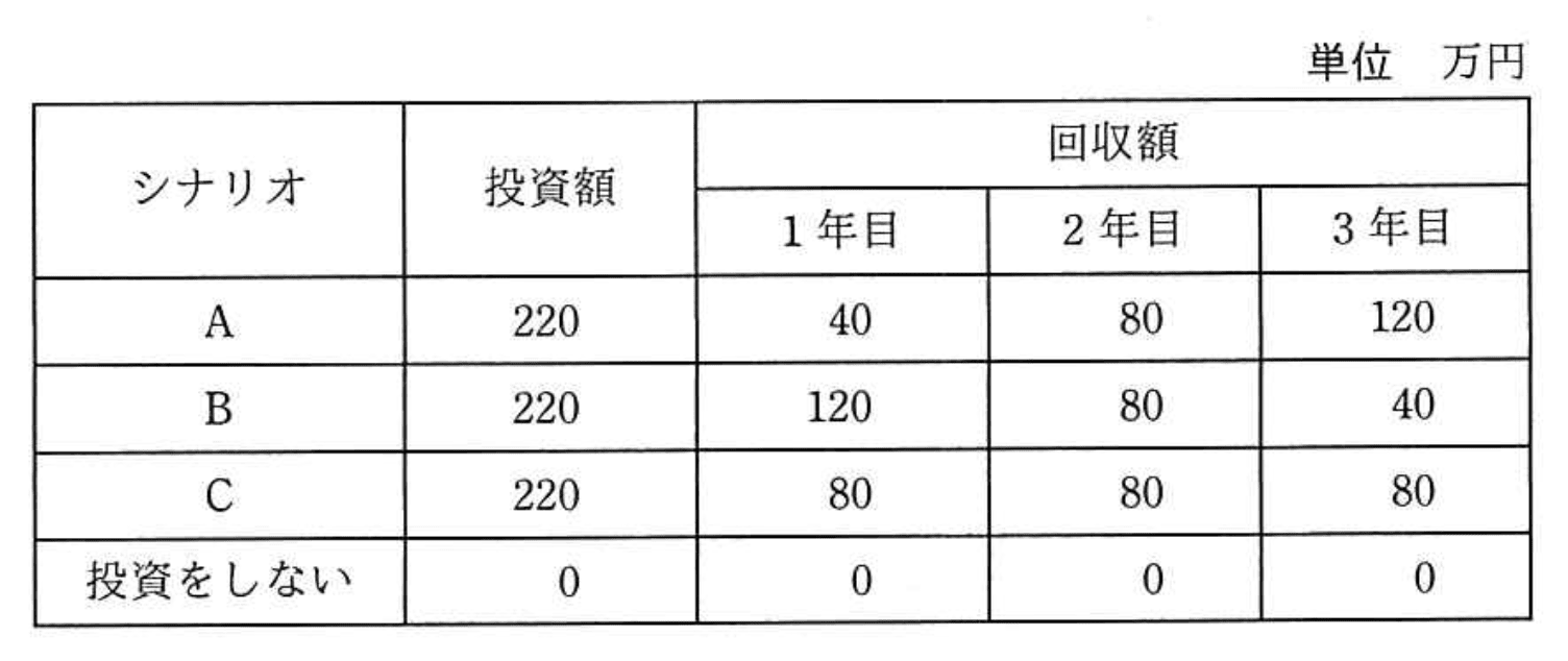 投資効果を正味現在価値法で評価するとき、最も投資効果が大きい(又は損失が小さい)シナリオはどれか。ここで、期間は3年間、割引率は5%とし、各シナリオのキャッシュフローは表のとおりとする。