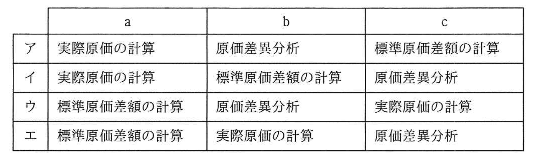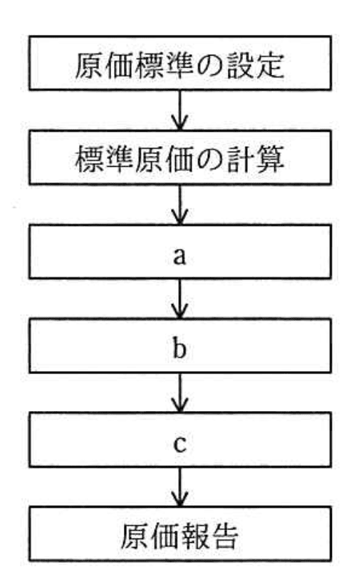 - ウ:aに「標準原価差額の計算」、cに「実際原価の計算」と、原価計算の順序が不適切。