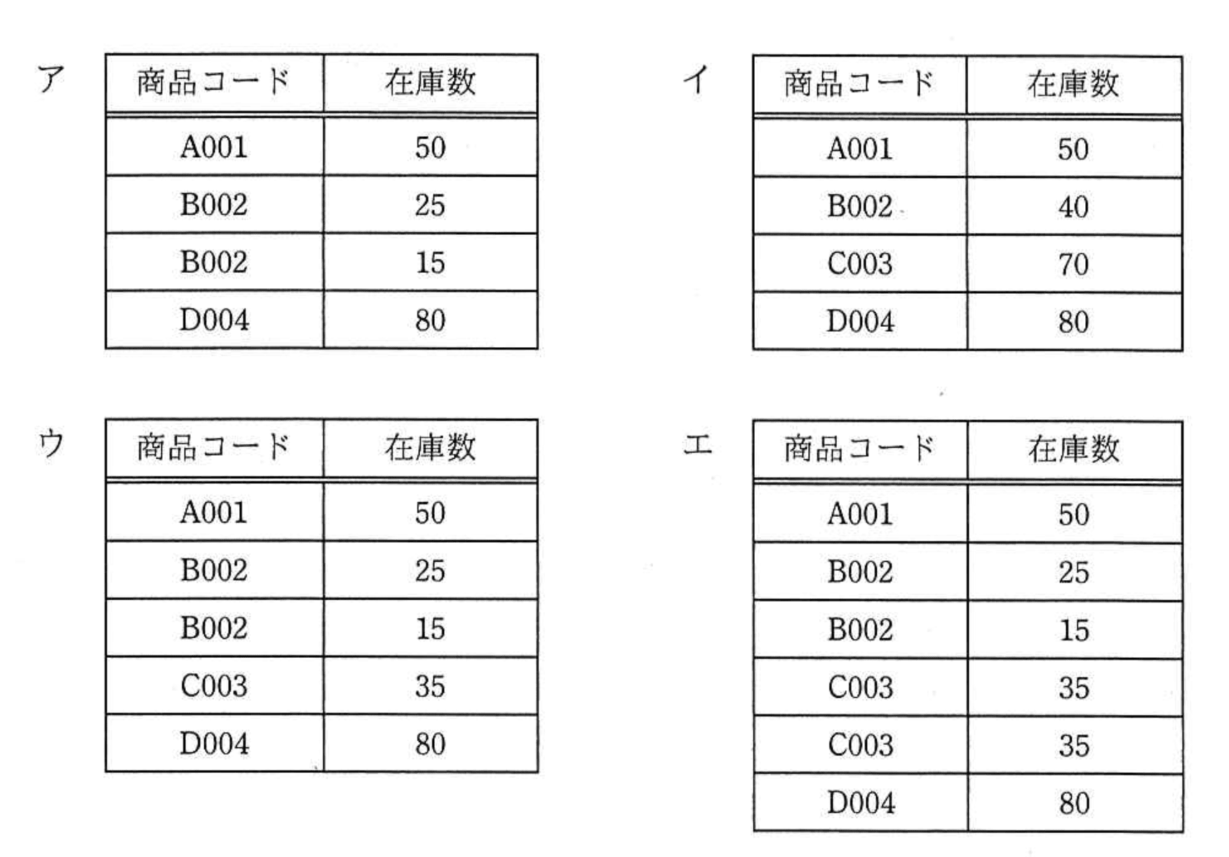 “東京在庫”表と“大阪在庫”表に対して、SQL文を実行して得られる結果はどれか。ここで、実線の下線は主キーを表す。