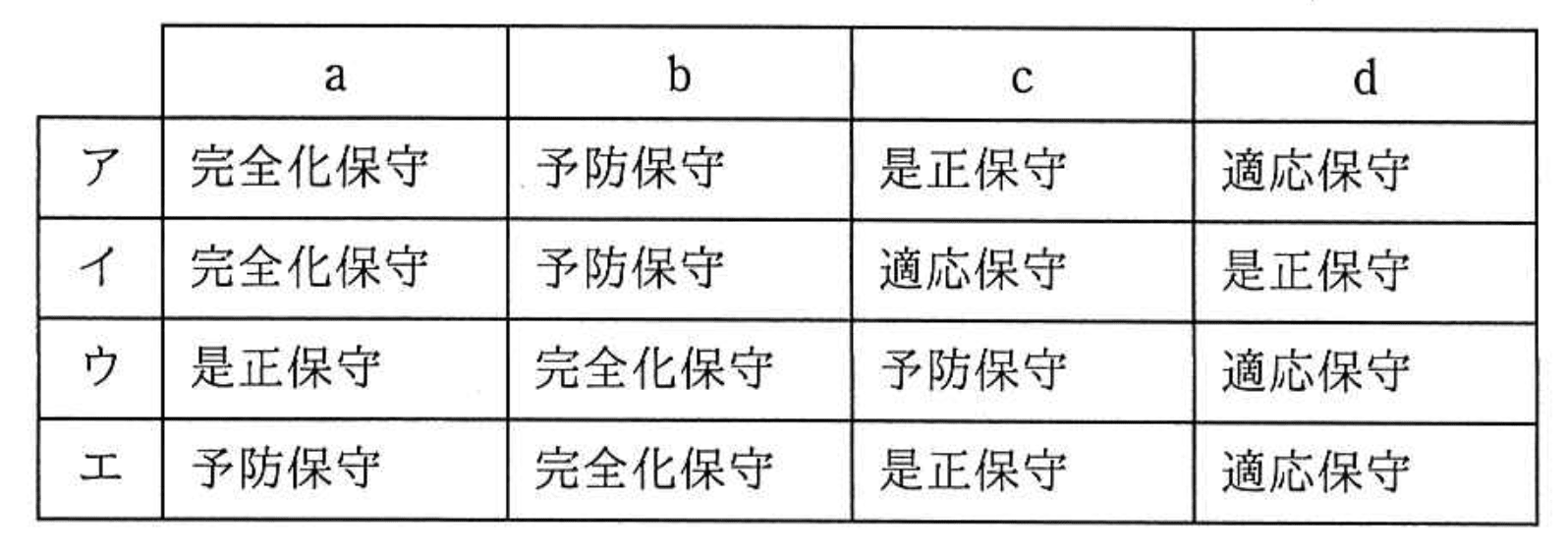 - ア:aが完全化保守で誤り。潜在的障害の訂正は予防保守が正しい。