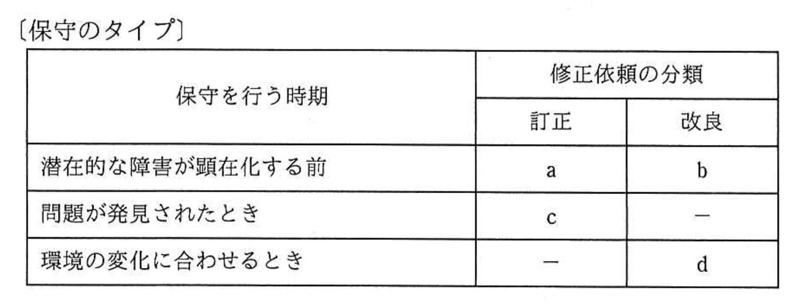 - 結論:修正依頼の分類は「a=予防保守」「b=完全化保守」「c=是正保守」「d=適応保守」が正しい組合せです。