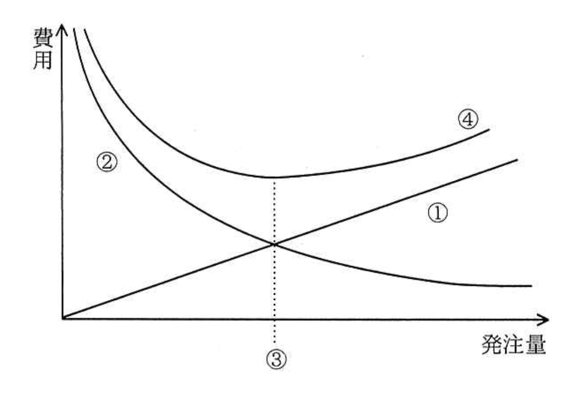 - 交点から垂直に下ろした③の位置は、総費用が最小となる発注量を示す。