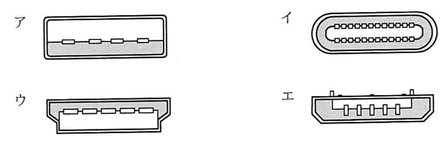 - ア:長方形の断面でピンが4つのみ。USB Type-Cの多ピン楕円形とは異なる。