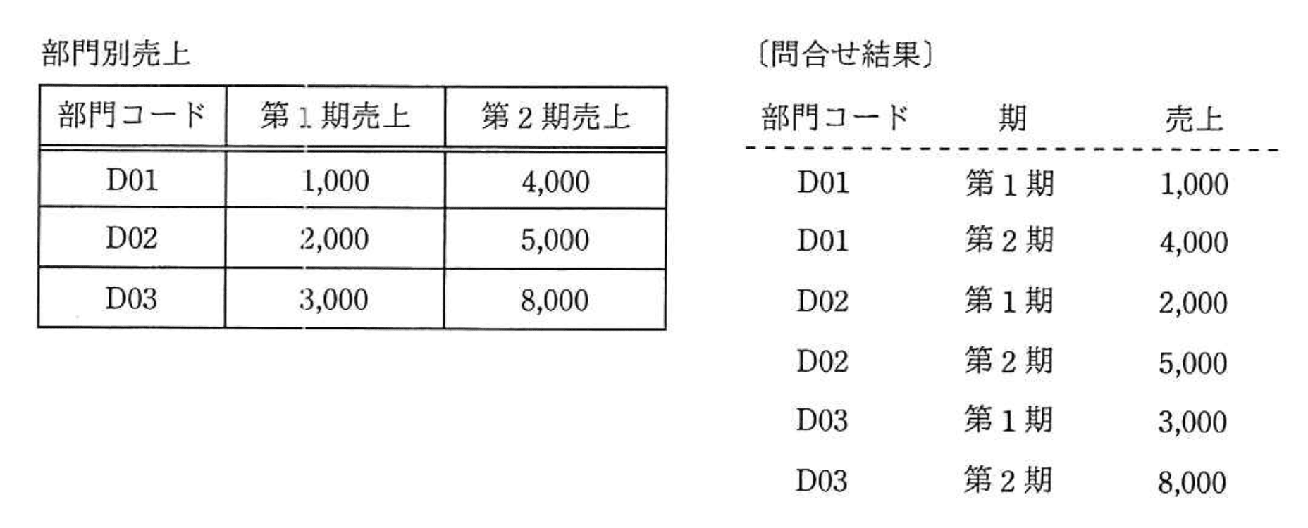 SELECT A.部門コード、 '第1期’AS期、 A. 第1期売上 AS 売上