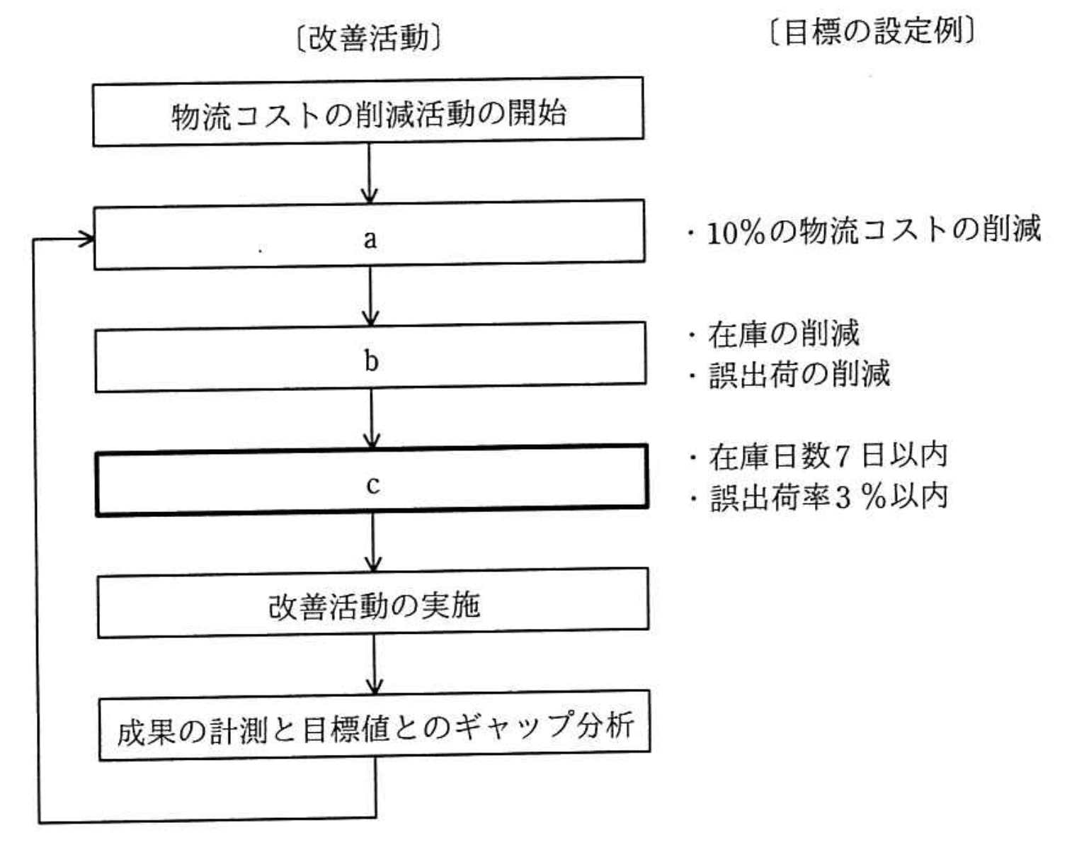 物流業務において,10%の物流コストの削減の目標を立てて、図のような業務プロセスの改善活動を実施している。図中のcに相当する活動はどれか。