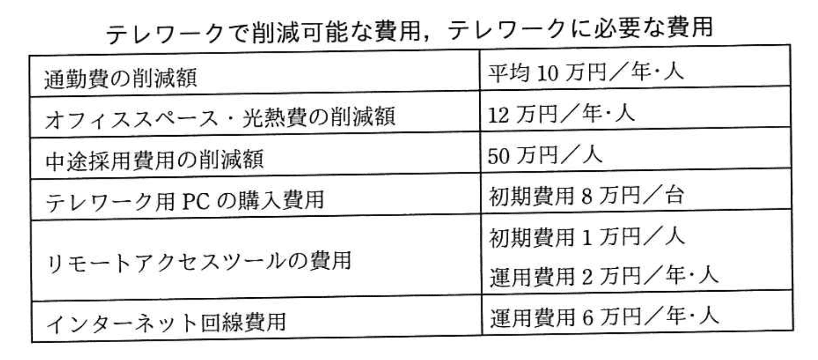 ・テレワーク対象者分の通勤費とオフィススペース 光熱費が削減できる。・在宅勤務によって、従来、通勤に要していた時間が削減できるが、その効果は考慮しない。