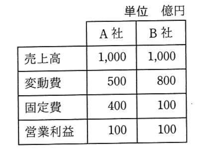 A社とB社は売上高と営業利益が同じですが、A社の変動費は500億円、B社は800億円と大きく異なります。変動費が低いA社は売上が増えた場合、増加分の売上がほぼ利益に直結しやすい構造です。つまり、売上高の増加が利益増加に大きく寄与するため、選択肢アが正解となります。