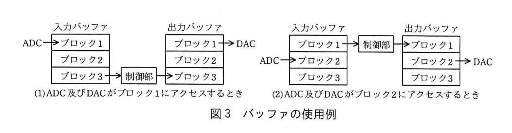 バッファの使用例を図3に示す。(1) ADC及びDACがブロック1にアクセスしているとき、制御部はブロック3にアクセスする。次に、(2) ADC及びDACがブロック2にアクセスしているとき、制御部はブロック1にアクセスする。