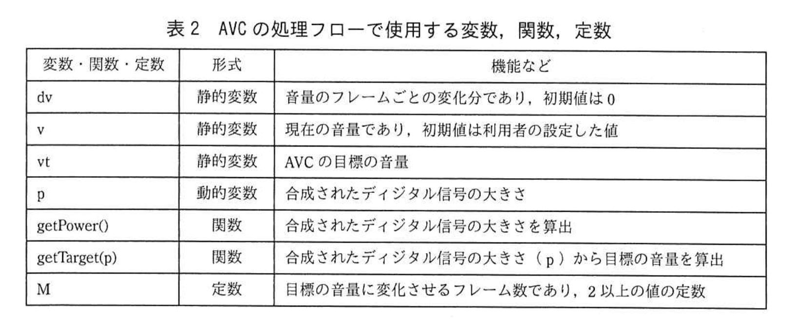 AVCの処理フローで使用する変数、関数、定数を表2に、AVCの処理フローを図4に示す。特定の条件では、目標の音量を決定したとき、直ちに音量を目標の音量にする。そのための判定を網掛けした判定部で行っている。演算は全て整数演算である。
