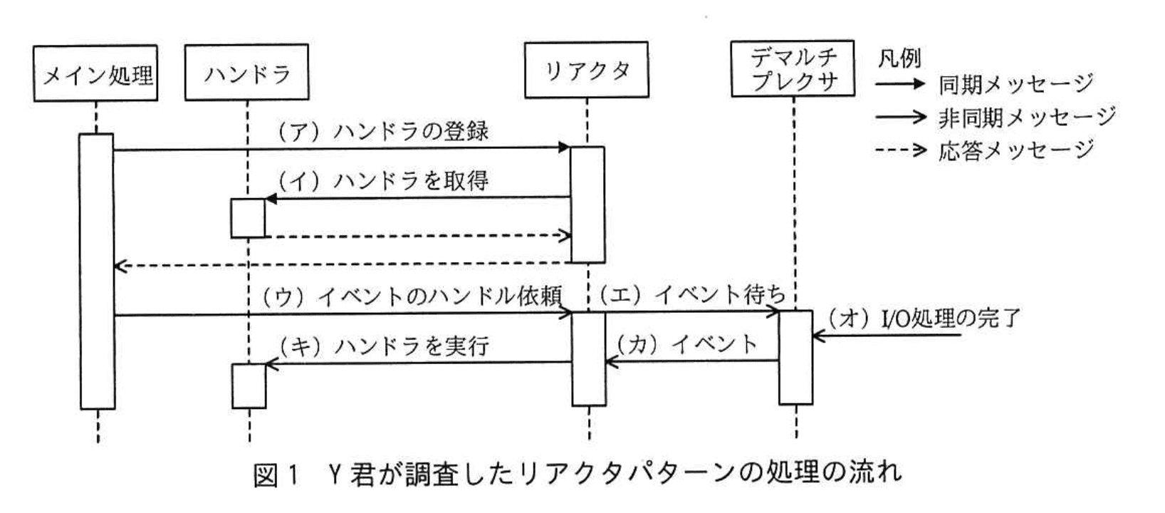 ノンブロッキング I/O 型のサーバソフトで、Webアプリを動作させるためには、非同期処理の考え方に基づいたソフトウェア設計が必要である。そこで、Y 君は、ノンブロッキング I/O 型の処理を実現するデザインパターンの一つであるリアクタパターンについて調査した。図1に Y 君が調査したリアクタパターンの処理の流れを示す。