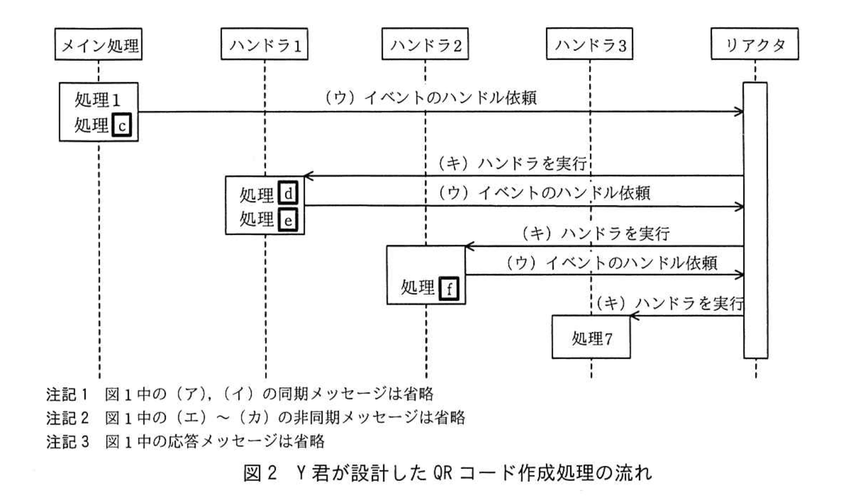 Y君は、リアクタパターンを用いて、スマホアプリからのアクセスに対する応答時間が最小になるように、QR コード作成処理を設計した。図2に Y君が設計した QR コード作成処理の流れを示す。