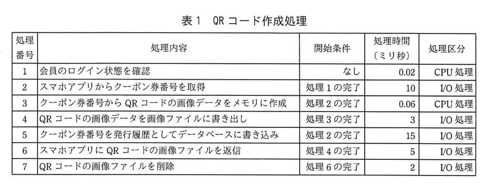 ブロッキングI/O型のサーバソフトでは、ネットワークアクセスやファイルアクセスなどのI/O処理を行う場合、CPUは低速なI/O処理の完了を待って次の処理を実行する。例えば、表1に示す、QRコードを作成するために必要なWebアプリの処理(以下、QRコード作成処理という)の場合、全体の処理時間のa%がI/O処理の完了待ち時間となる。