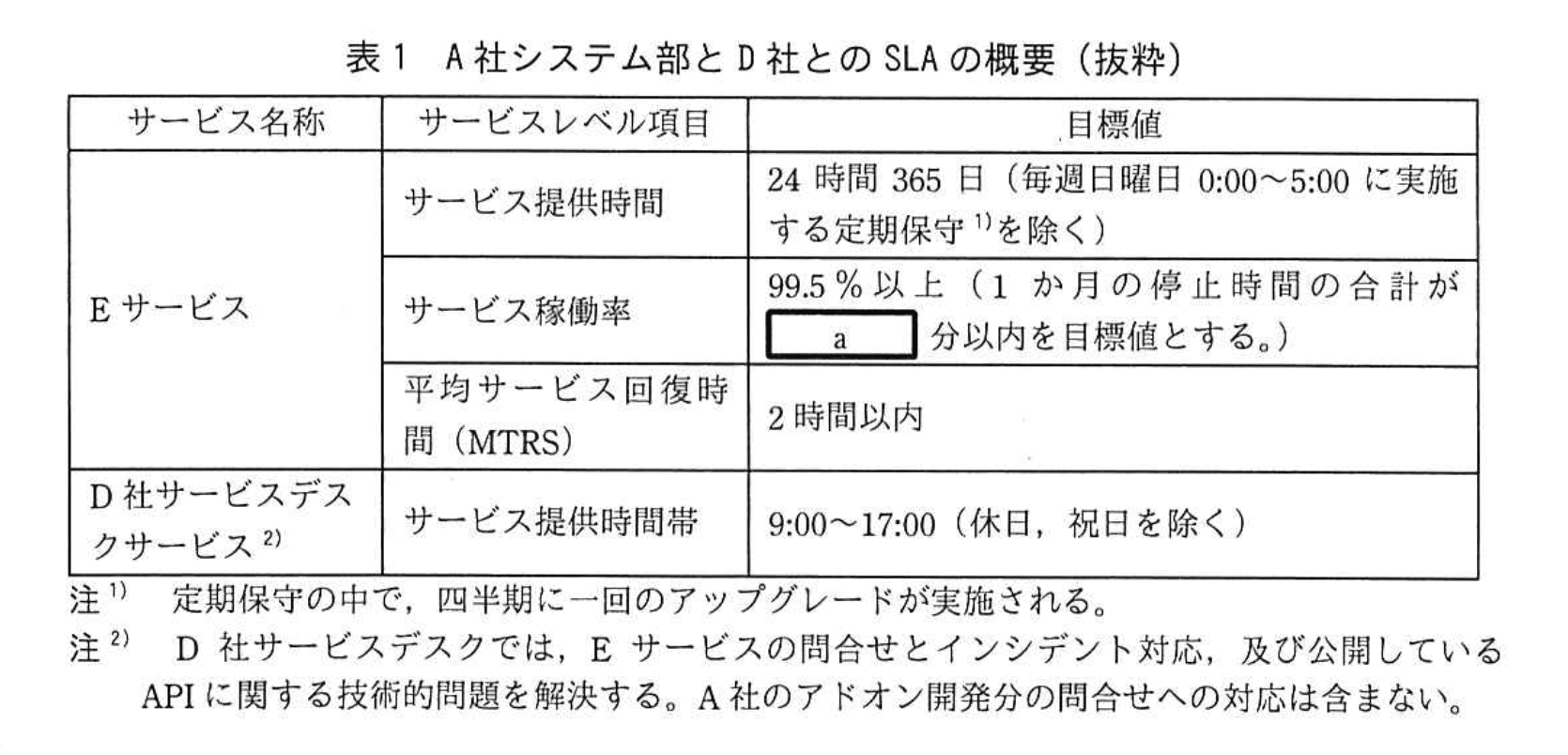 (6) Eサービス及びD社サービスデスクサービスに関するA社システム部とD社とのSLAの概要〔抜粋〕を表1に示す。